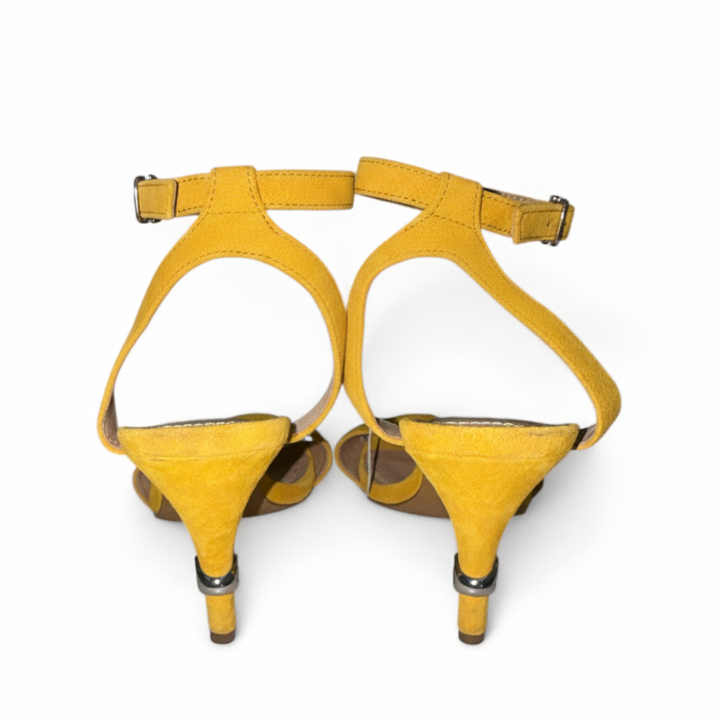 Step out in style with these stunning yellow suede Coach heels. Featuring a sleek open-toe design and adjustable ankle straps for a secure fit, these heels add the perfect pop of color to any outfit. The soft suede finish and signature Coach detailing make them both elegant and comfortable. Good condition.