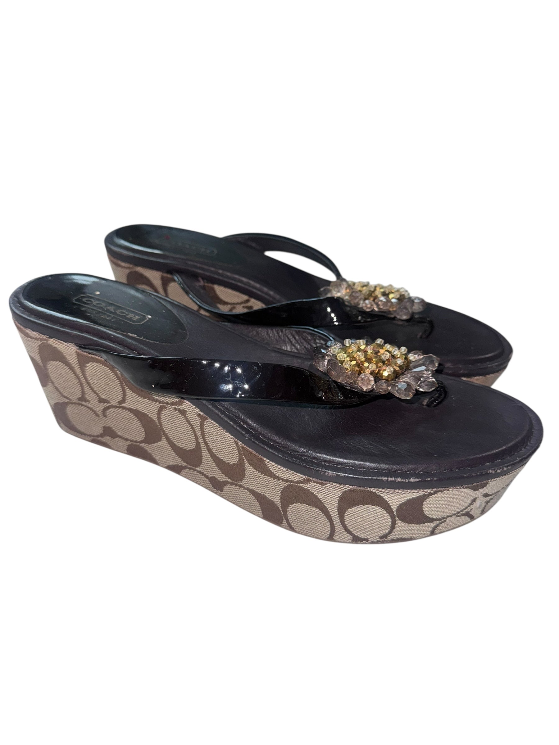 includes a signature “C” canvas hobo bag with tan leather trim and matching black jeweled Coach sandals. Great condition.