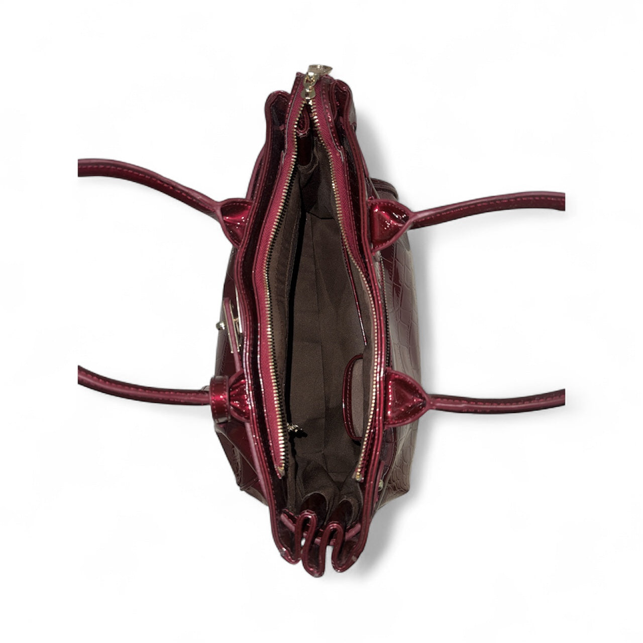 Elegant red crocodile-textured handbag with dual handles and gold tone accents. Excellent condition
