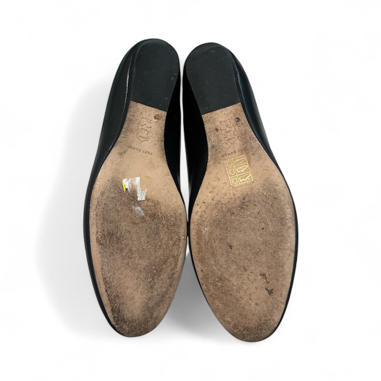 A Classic Tory Burch handbag with an attachable shoulder strap, paired with matching leather flats both featuring the classic Tory Burch logo in Gold. A sleek combo that completes an outfit. Excellent condition